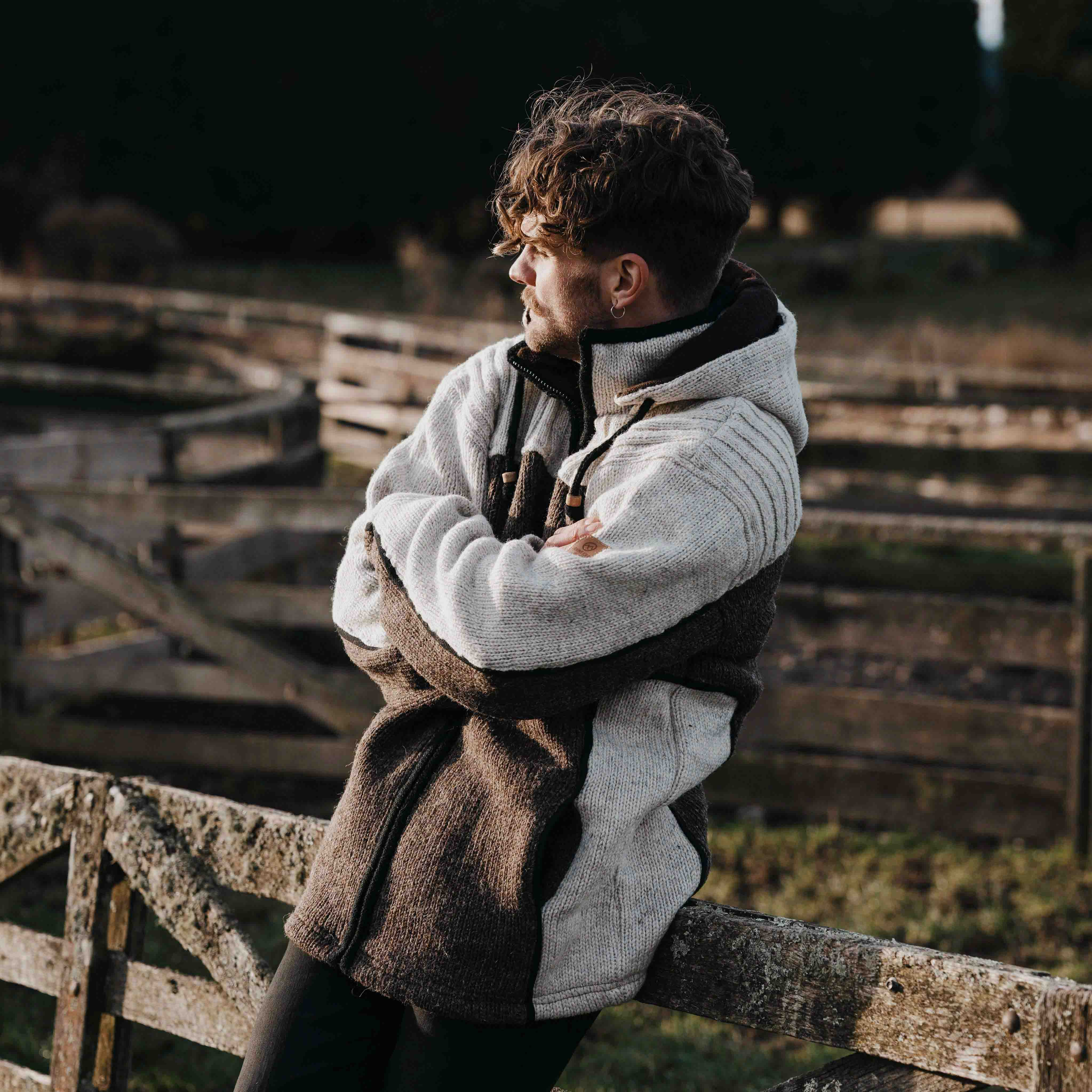 Dark natural brown wool body with an oat-coloured ribbed knit across the shoulders for a stylish contrast.